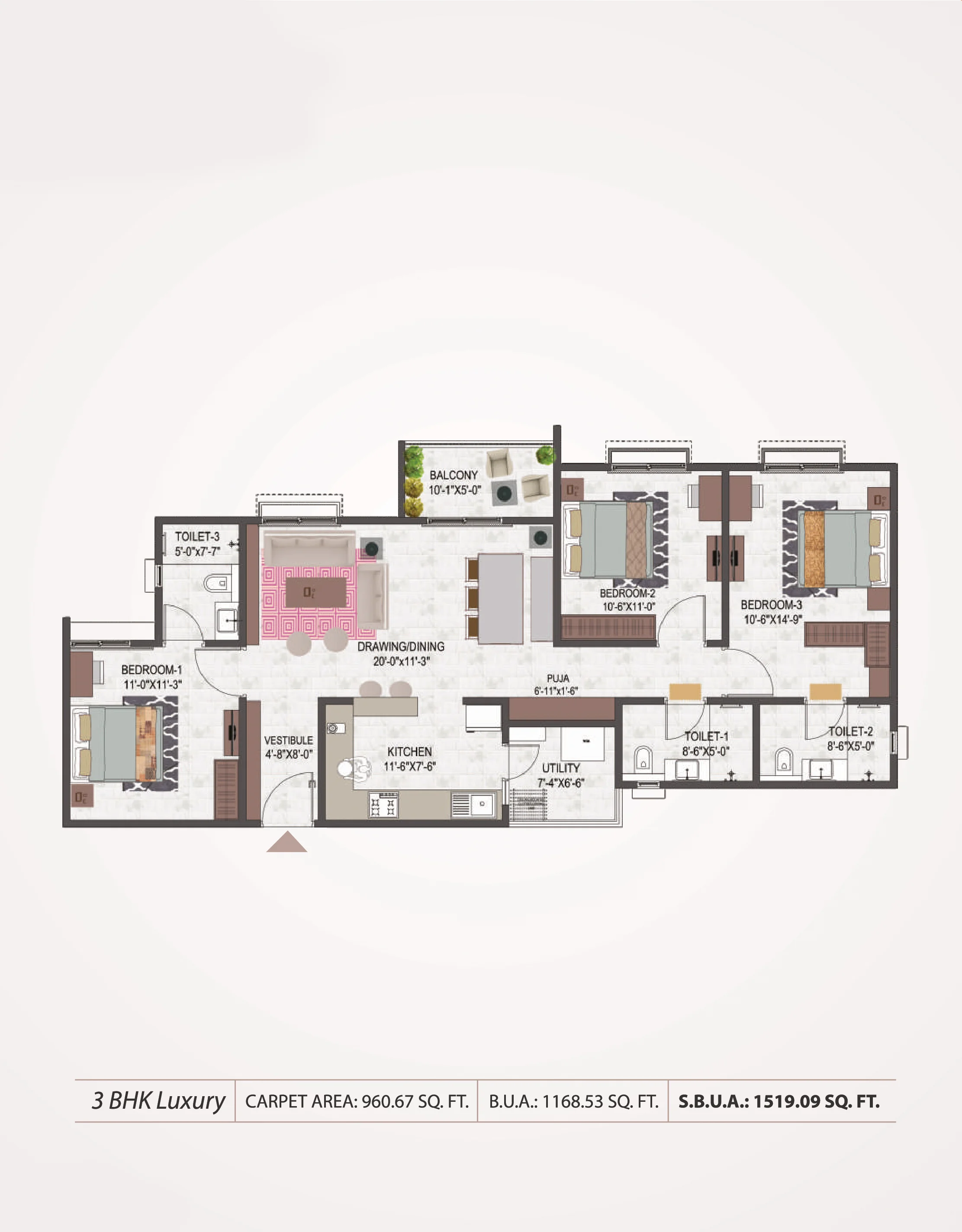 | 3BHK | 3 | 3 | 960 Sqft. | 5.5 Cr. |